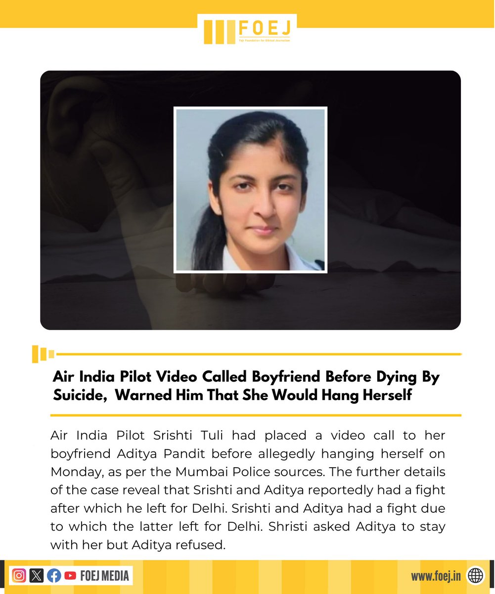 #AirIndiaPilot Srishti Tuli had placed a video call to her boyfriend Aditya Pandit before allegedly hanging herself on Monday, as per the Mumbai Police sources. The further details of the case reveal that #SrishtiTuli and Aditya reportedly had a fight after which he left for