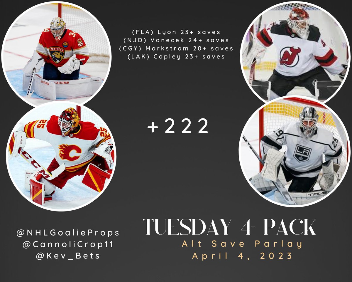 🚨TUESDAY 4-PACK🚨 A collab you dont want to miss #GamblingTwitter! The boys have put their heads together to come up with a 4-pack alt save parlay for you! +222 @kev_bets @CannoliCrop11 @NHLGoalieProps #playerprops #altlines #NHL #fanduel #prizepicks #collab #DraftKings