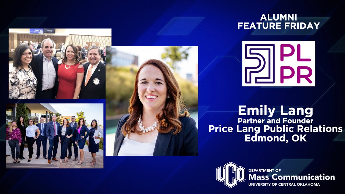An #AlumniFeatureFriday shout out to @UCO_MCOM Alum @emilylangok, Partner & Co-Founder of Price Lang PR! Before Price Lang, Emily served as the Special Projects Director and PIO for the OK Attorney General's Office. She continues to support MCOM with the Price Lang Scholarship.