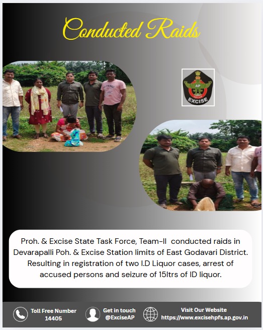 Proh. & Excise State Task Force, Team-II conducted raids in Devarapalli P&E Station limits, East Godavari District. ✅ 2 ID liquor cases registered ✅ 15 litres of ID liquor seized #ExciseEnforcement #EastGodavari #AndhraExcise #IDLiquorRaid