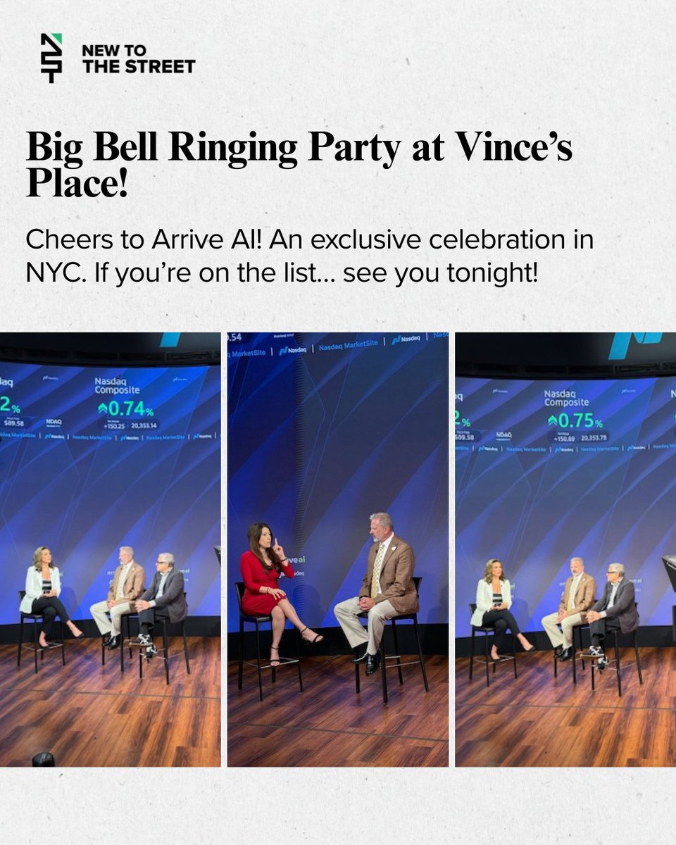 Big Bell Ringing Bash in NYC 🔔🎉 It’s a celebration at Vince’s place for the big moment, Arrive AI hits the bell! 🏙️🥂 @vincemedia1 Invite Only. Major vibes. Major milestone. Follow New to The Street for exclusive behind-the-scenes from the bell to the afterparty. #ArriveAI