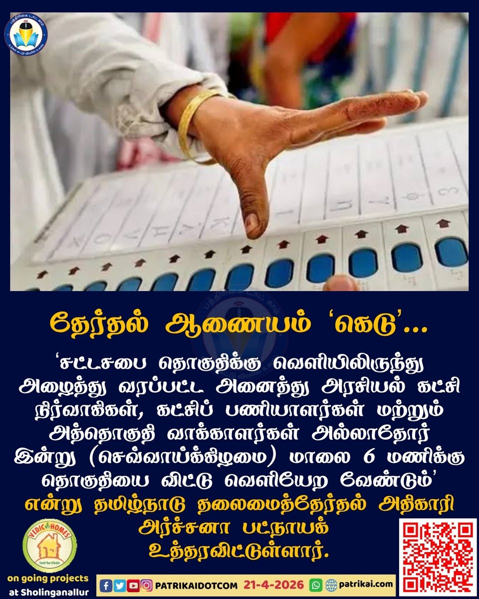 தொகுதிக்கு வெளியிலிருந்து அழைத்து வரப்பட்ட வாக்காளர்கள் அல்லாத நபர்கள் இன்று மாலை 6 மணிக்கு தொகுதியை விட்டு வெளியேற வேண்டும் - தேர்தல் ஆணையம் உத்தரவு #TNElection #TNAssembly #Assembly #election