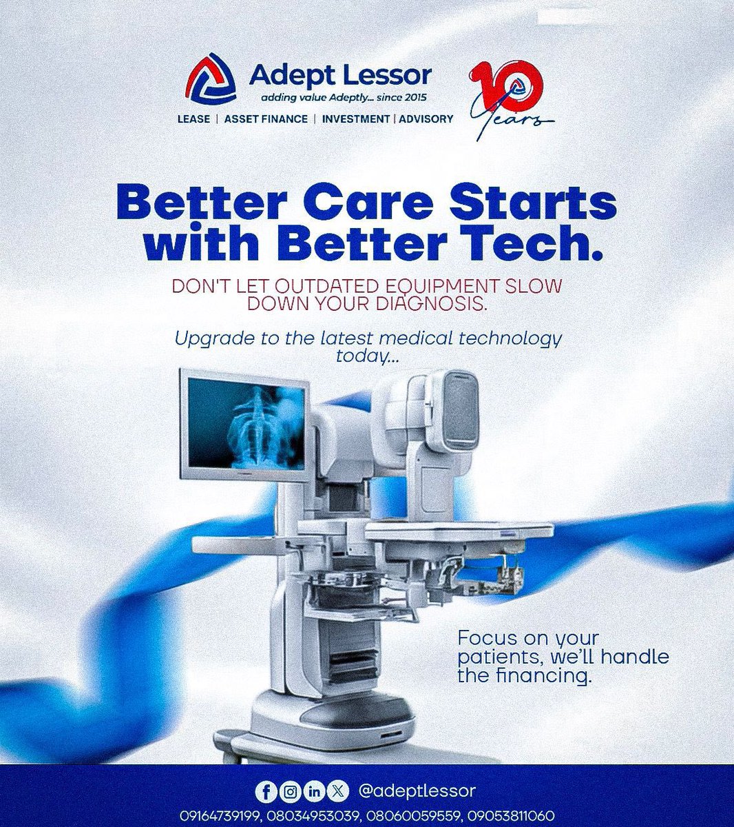 Outdated equipment shouldn’t slow down diagnosis. With flexible leasing, you can upgrade to the latest medical tech today and pay with ease over time. Your patients deserve the best. We make it possible. #buynowaysmallsmall #assetfinancing #leasing #leasinginlagosnigeria