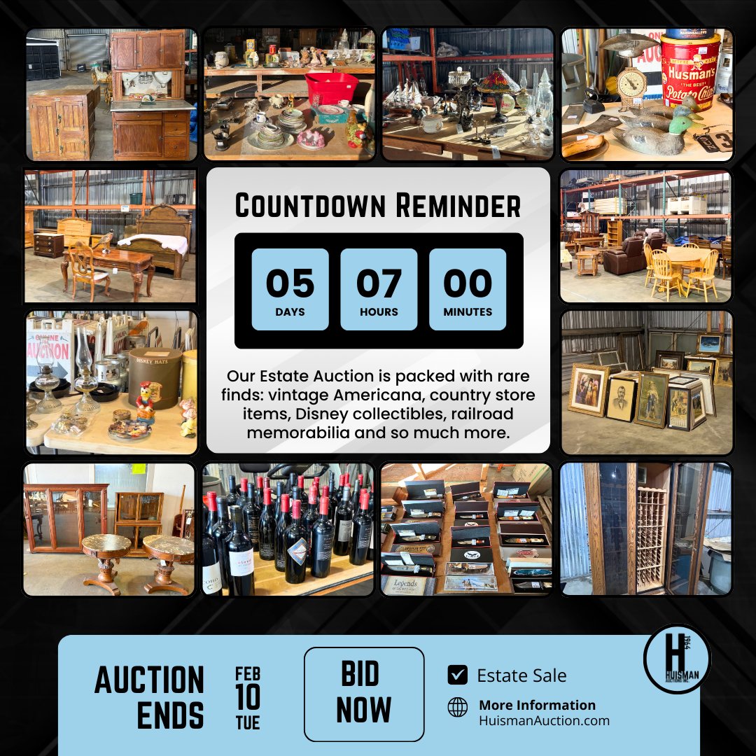 ⏰ 5 days, 7 hours left! Our estate auction is loaded with rare finds—Americana, country store items, Disney collectibles, railroad memorabilia & more. 🗓 Ends Feb 10 | 1 PM 💻 HuismanAuction.com #AuctionCountdown #EstateSale #Collectors #OnlineAuction #BidOnline #LodiCA