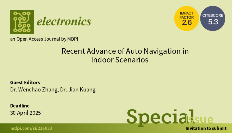 📢 #CallforPapers for the #specialIssue of “Recent Advance of #AutoNavigation in Indoor Scenarios ”! Guest Editors: Dr. Wenchao Zhang, and Dr. Jian Kuang 👉Find out more at: mdpi.com/si/216033 #mdpielectronics #openaccess #electronics
