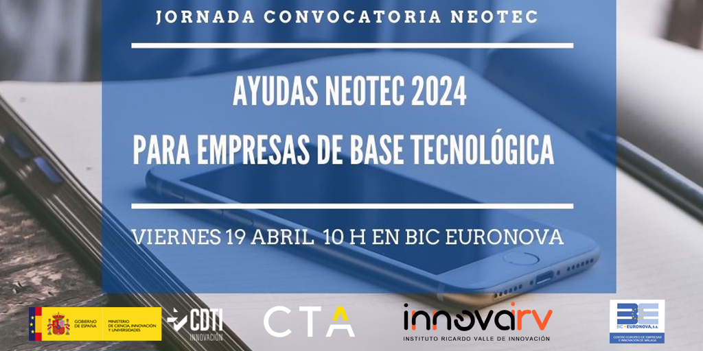 📢 El próximo 🗓️24-ABR la #ADER, en colaboración con el CDTI Innovación, celebra una Jornada de Presentación de la convocatoria 2024 de #AyudasNeotec dirigida a #EmpresasDeBaseTecnológica 👇 +info ➡️ bit.ly/3QwNGYn #ebts #Neotec2024 #Neotec