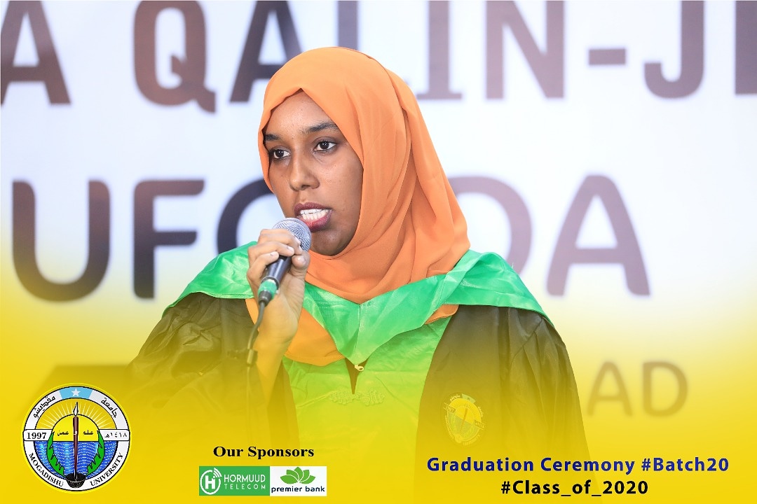 Wasiiradda Haweenka iyo Arimaha Qoyska Marwo Xaniifa Maxamed Ibrahim "Waxaan hambalyo leeyahay Jaamacadda Muqdisho iyo ardayda dufcadda 20aad". xafladda qalinjabinta dufcada 20aad ee Jaamacadda Muqdisho. #MU_CLASS_OF_2020 #BATCH20