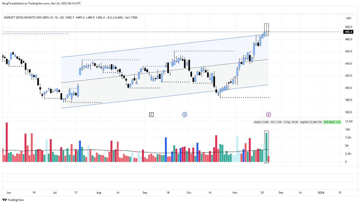 housebuilders taking a hit. Barratt Developments #BDEV expected to report a 40% fall in earnings in FY24 with forecast pe of 11. trading at around 16% under book value. TA wise still above 200dma but in danger of falling out of channel since sept 22 ( fib acting as support)