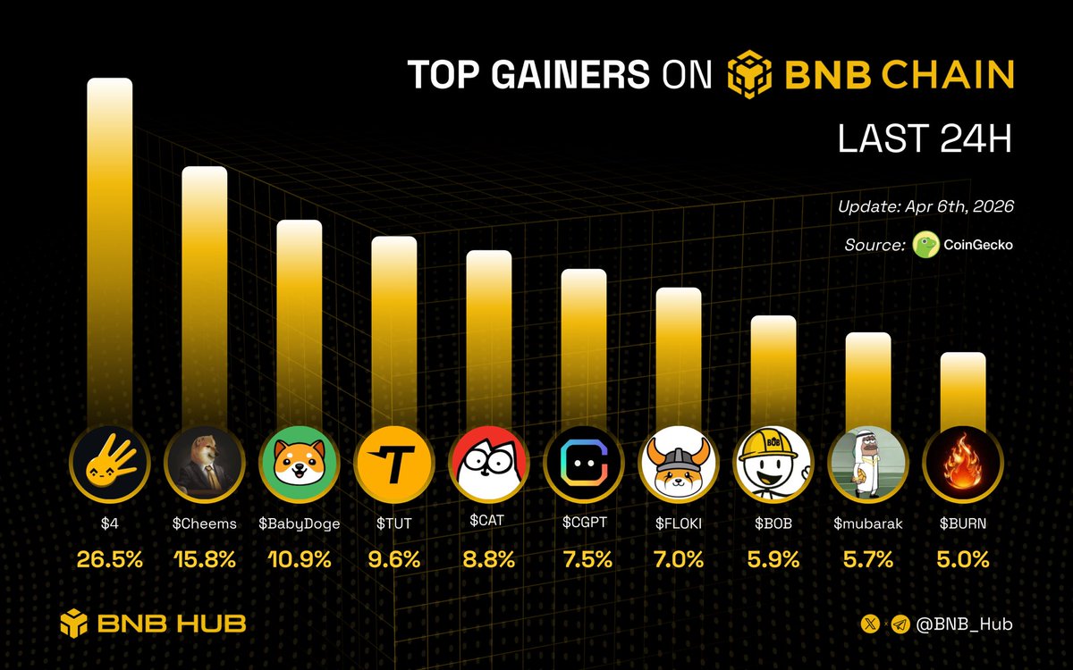 Top Gainers on #BNBChain last day! What’s mooning right now?👇 $4 $Cheems $BabyDoge $TUT $CAT $CGPT $FLOKI $BOB $mubarak $BURN