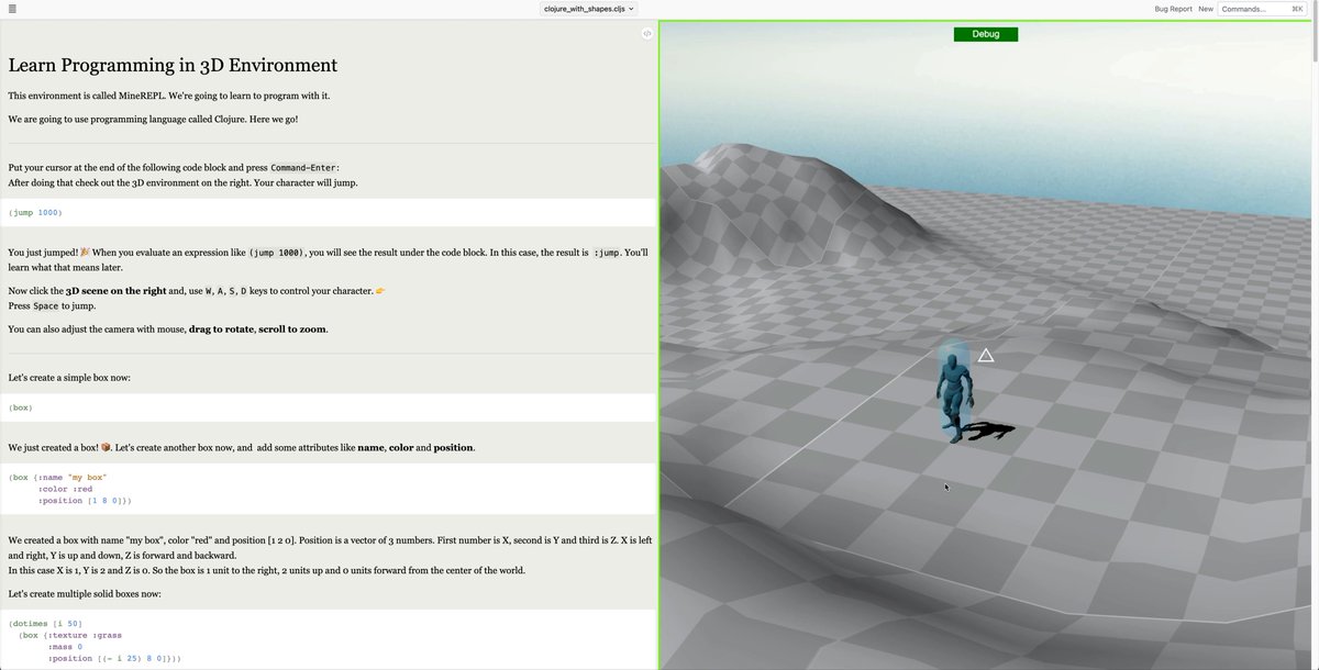 MineREPL is currently under development. It’s a visual & interactive web tool designed to teach programming & game development 🎮👩💻! Dive into a 3D scene, using #Clojure for coding & #BabylonJS for stunning renders. Stay tuned for a unique learning experience!💡 #webgl #gamedev