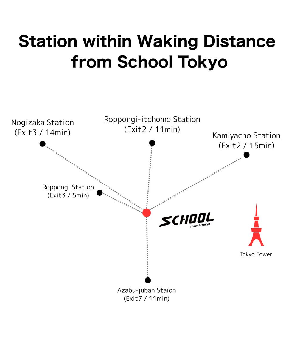 📍 SCHOOL TOKYO、 実は「徒歩15分以内で5駅アクセスできます」 ・六本木(5分) ・乃木坂(14分) ・六本木一丁目(11分) ・麻布十番(11分) ・神谷町(15分) イベントがない日はバー営業してます。 寄って、飲んで、別の駅から帰るのもアリです。 #schoolivebar #BARTIME #六本木