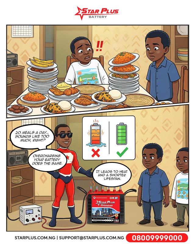 Powering too much at once? ⚠️ Just like 20 meals a day is too much for the body… overcharging your battery does the same 🔋🔥 It builds heat, reduces efficiency, and shortens lifespan. Charge smart. Power smarter. ⚡ #StarPlusBattery #BatteryCare #PowerSmart #EnergyEfficiency