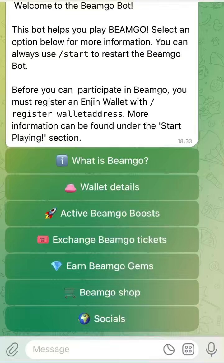 Join the #Beamgo games and get #NFTs #Enjin and $ENJ as well. Link your Enjin Wallet to participate. 👉🔗 t.me/beamgo_bot?sta… Here's how to link your Enjin Wallet: 👇 /register Your address (efUQsiaoBKG1p7qbN) #Enjin💜 #EnjinNFT #NFTGiveaways #Enjineers🟪 #NFTCommunity