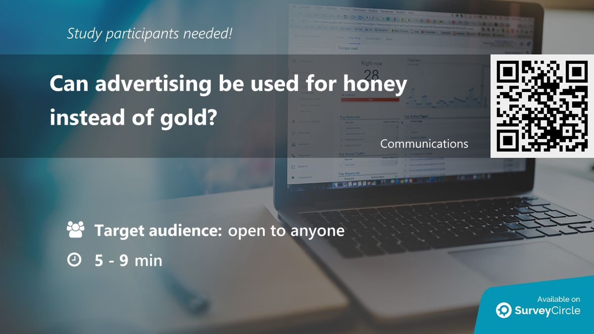 Participants needed for online survey! Topic: "Can advertising be used for honey instead of gold?" surveycircle.com/ZH2229/ via @SurveyCircle #univienna #marketing #BeeKnowledge #NoncommercialAdvertising #percepetion #bee