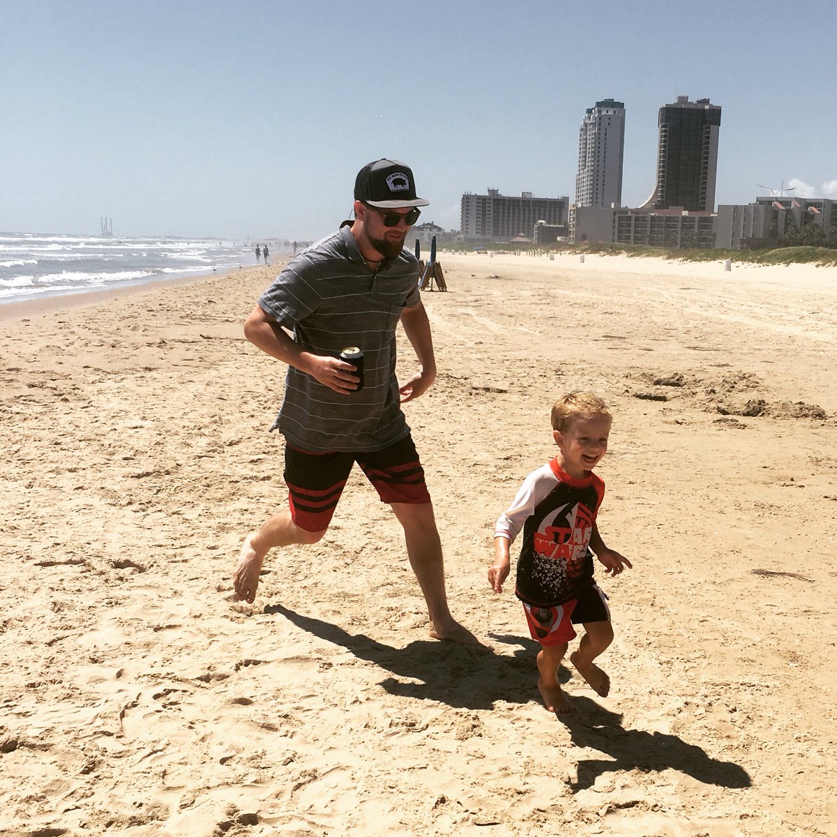 I’m gna getcha.. 😊🏝chasing him, who is chasing seagulls ALL DAY 📷 by the beautiful @jennystead #beerinhand #beach #myson