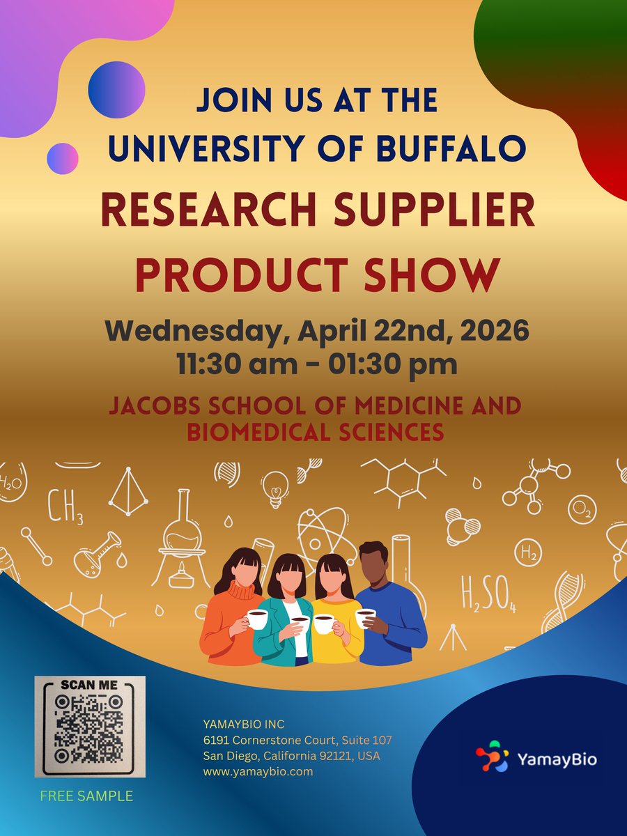 Buffalo: we’re here tomorrow! Join us at the University at Buffalo Research Supplier Product Show 📍 Jacobs School of Medicine ⏰ 11:30 AM – 1:30 PMStop by for a FREE sample 👀#Biotech #LabLife #Science #Research #YamayBio #ScientistSolutions #UBuffalo #WetLab #Innovation