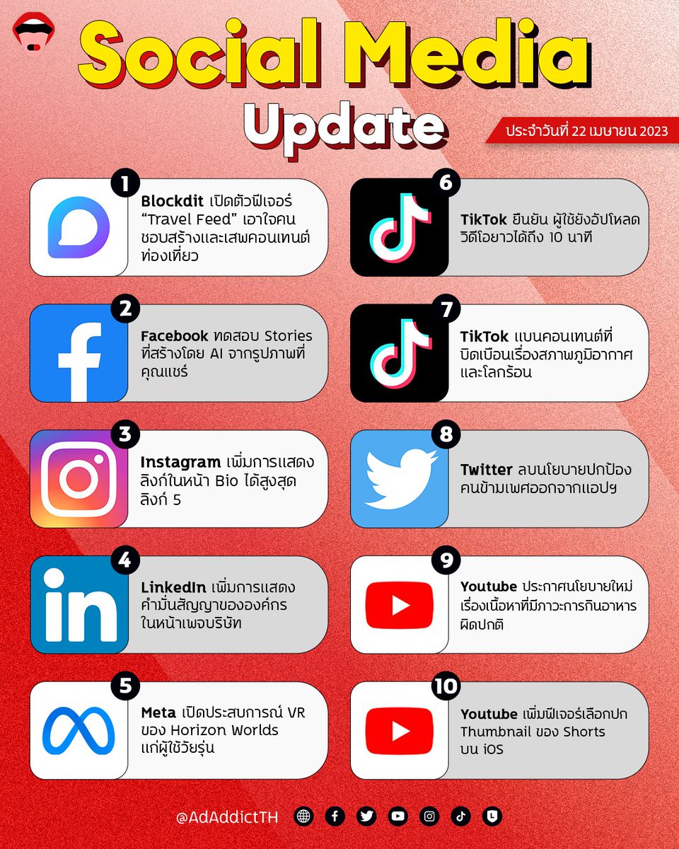 Update 10 ข่าวการเปลี่ยนแปลงของ Social Media ประจำวันที่ 22 เมษายน 2023 อ่านข่าวสารแบบเต็ม ๆ ได้ที่นี่ : bit.ly/40tnyiU #ADADDICT #Blockdit #Facebook #Instagram #LinkedIn #Meta #TikTok #YouTube