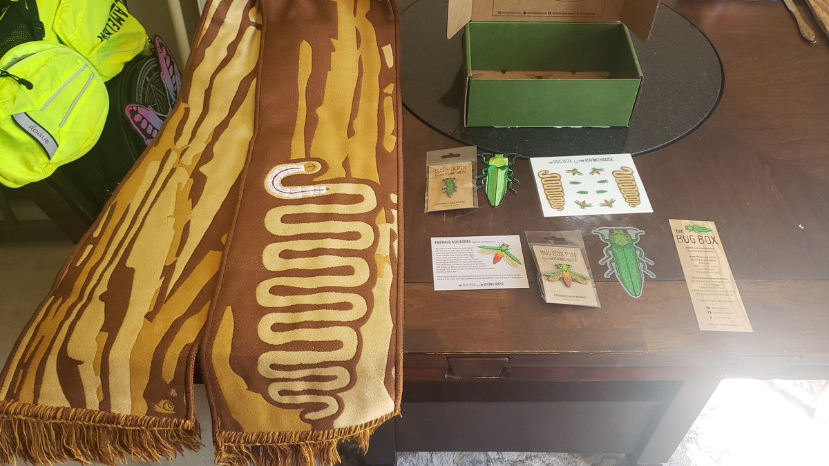 Got my #BugBox in today and I am SO HAPPY. Look at this adorable scarf with the larvae in the wood! It's warm and soft! I LOVE scarves and this is hands down the most unique one I own now. So happy, big shout out to The Roving House for this awesome box
