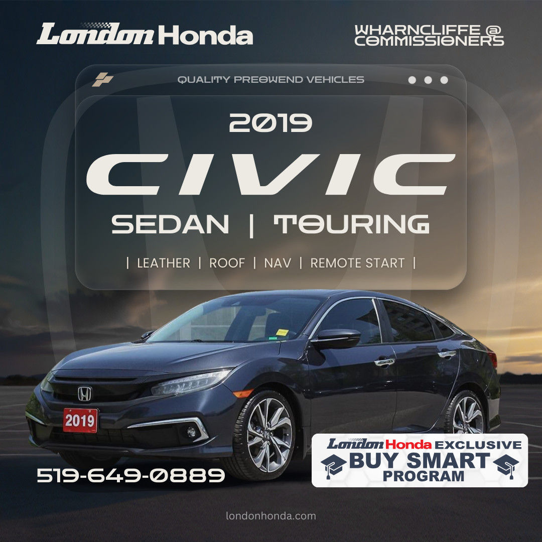๐ Discover luxury in the 2019 Honda Civic Sedan Touring! ๐ Leather-trimmed seats, Honda Sensing, and a turbocharged engine for thrilling drives. Plus, our BuySmart Program gives you: ๐๏ธ #HondaCivic #LondonHonda #BuySmartProgram ๐ 519-649-0889 bit.ly/46yrDXM