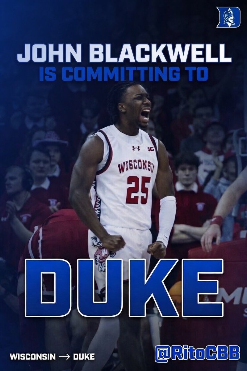 BREAKING: Wisconsin junior John Blackwell is transferring to Duke, sources tell me. Jon Scheyer wanted to add a veteran scorer to his squad. Blackwell averaged 19.1 points and 5.1 rebounds per game last year for the Badgers. #CBB #TransferPortal #Duke