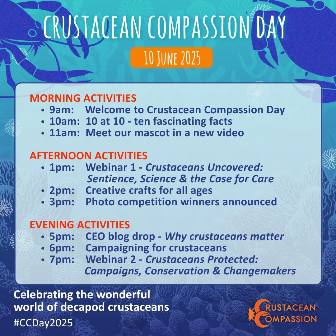 Today is #CrustaceanCompassionDay! We’re joining @crab_welfare to celebrate crabs, lobsters & prawns – and call for better protection for these sentient animals. Learn more & join the free webinars⬇️ crustaceancompassion.org/supportus/crus… #CrustaceanCompassion #CCDay2025