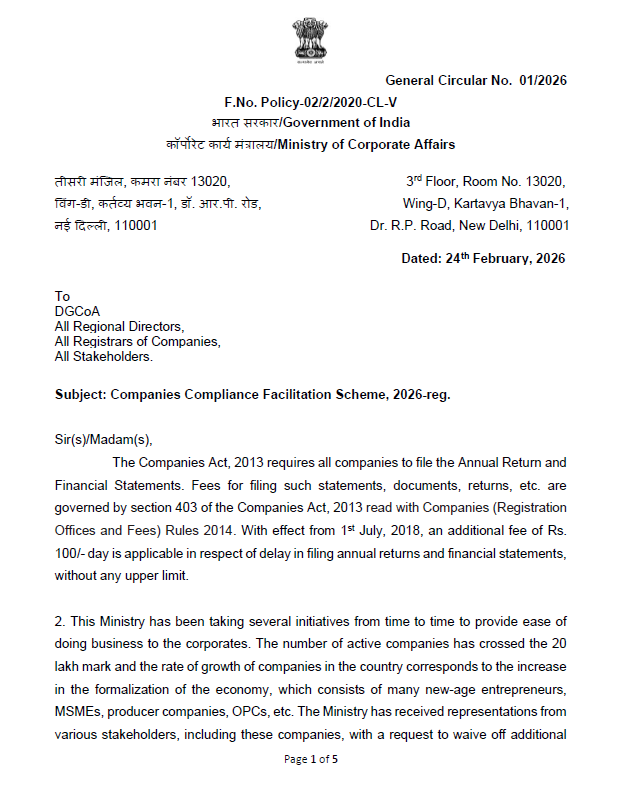 💥Big Relief for Companies @MCA21India launches Companies Compliance Facilitation Scheme,2026) 📌File pending Annual Returns & FS at just 10% of additional Fee 📌Dormancy@ 50% fee 📌Strike off@ 25% fee 🗓 15 Apr – 15 Jul 26 Link for Circular surl.li/irhpyn #CCFS