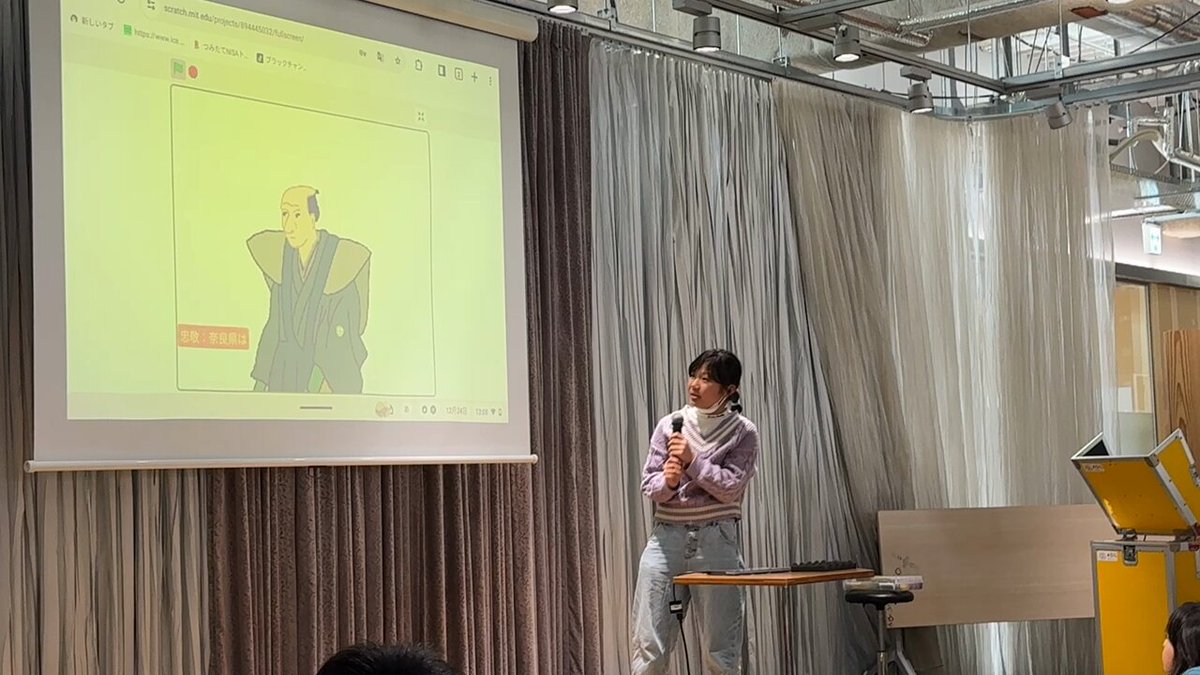 コスチュームの残像とか、エフェクトとかへのこだわりがたくさん見られる作品は、見てるこっちも楽しくなる。表現のこだわりは、Scratchのサイトに掲載されている他のユーザが作った作品をかなり参考しているとのこと。Creative Learning だなぁ。 #CDKSPD2023
