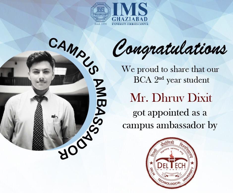 IMS Ghaziabad (University Courses Campus) feels proud to share that our student Mr. Dhruv Dixit, has been appointed as campus ambassador of IMSUC Ghaziabad by DTU Delhi in association with Microsoft Technology Associate. #imsghaziabad #campusambassador #CIACawarded #CEGRawarded