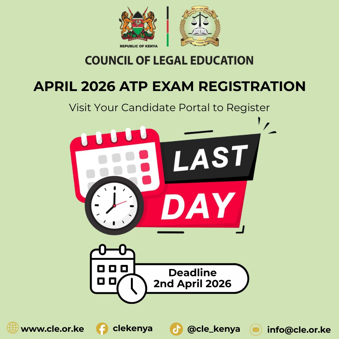 Today is the deadline to register for the April 2026 ATP Examination. Register now or complete your registration via the candidate portal. For support, write an email to [email protected] or Call/WhatsApp 0719 150 000 #CLE #ATPExam #LegalEducation #LastDay #ATPApril2026