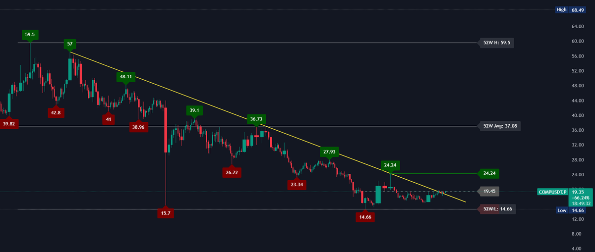 $COMP big rise on daily COMP chart 👀 it is now testing a 6 months long Trendline and if we can break above it we should hit at least $26.5 near Daily dark blue 200 MA line NFA #compusdt #compound #comp