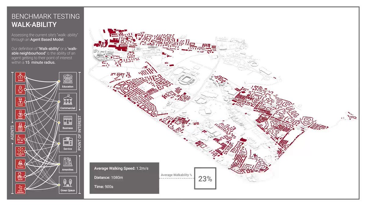 Agent Based Model testing runs a benchmark calculation on the average walkability of the existing site, aiming to increase agent satisfaction via accessibility and an improved network system. #CPUai #Complexurban #codeyourowntools @fjpalacio @sehaam_u @dgungaphul @aishaazulfiqar