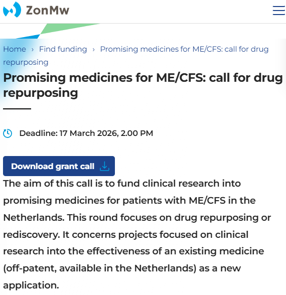 Netherlands: Great to see funding opportunities like this. Hopefully there will be sufficient applicants to ensure the €3.5 million available is used up. Please highlight widely "Promising medicines for ME/CFS: call for drug repurposing" zonmw.nl/en/subsidy/pro… #MEcvs #CVS