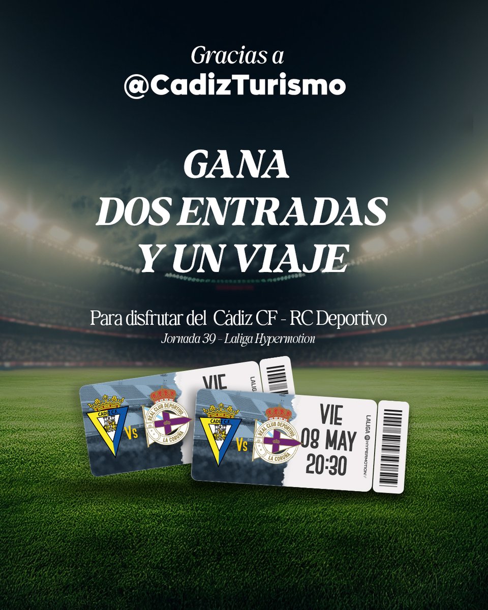 ¿𝐐𝐮𝐢𝐞𝐫𝐞𝐬 𝐯𝐞𝐧𝐢𝐫 𝐚𝐥 #CádizDeportivo 𝐝𝐞 𝐥𝐚 𝐦𝐚𝐧𝐨 𝐝𝐞 @CadizTurismo? 😄 🗳️ Sorteamos 𝐯𝐢𝐚𝐣𝐞 + 𝐝𝐨𝐬 𝐞𝐧𝐭𝐫𝐚𝐝𝐚𝐬 para que vengas y disfrutes del #Cádiz y 𝐧𝐮𝐞𝐬𝐭𝐫𝐚 𝐩𝐫𝐨𝐯𝐢𝐧𝐜𝐢𝐚. 📌 👉 Síguenos a @Cadiz_CF y @CadizTurismo y entra en el