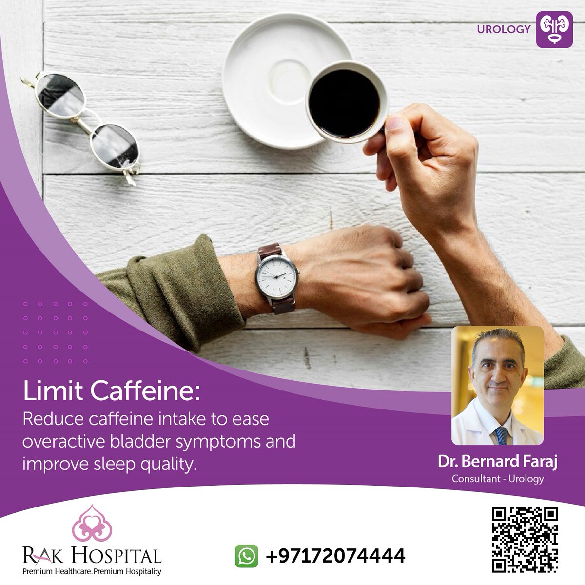 Limit Caffeine: ☕ Reduce caffeine intake to ease overactive bladder symptoms and improve sleep quality. #BladderHealth #CaffeineControl #Urology #urologyproblems #urologyawareness #RAKHCares #RAKHospital