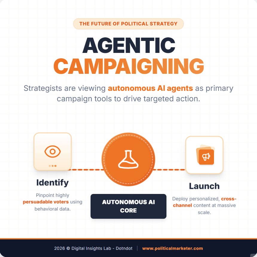 Campaigning is becoming agentic. • Identify persuadable voters • Autonomous AI Core drives decisions • Launch cross channel content at scale • Real time optimization #AgenticAI #CampaignTech #AIinPolitics #DigitalStrategy #PoliticalInnovation