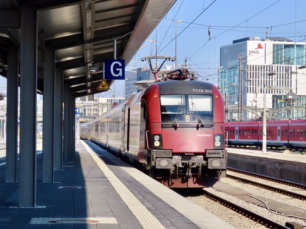 Siemens #Class116 116203 ‘Spirit of Linz’ arrives at gleis 11, with a rake of Viaggio Comfort stock, to form ÖBB Railjet Express 63 0911 München Hauptbahnhof > Budapest-Keleti 🇩🇪 28/07/22