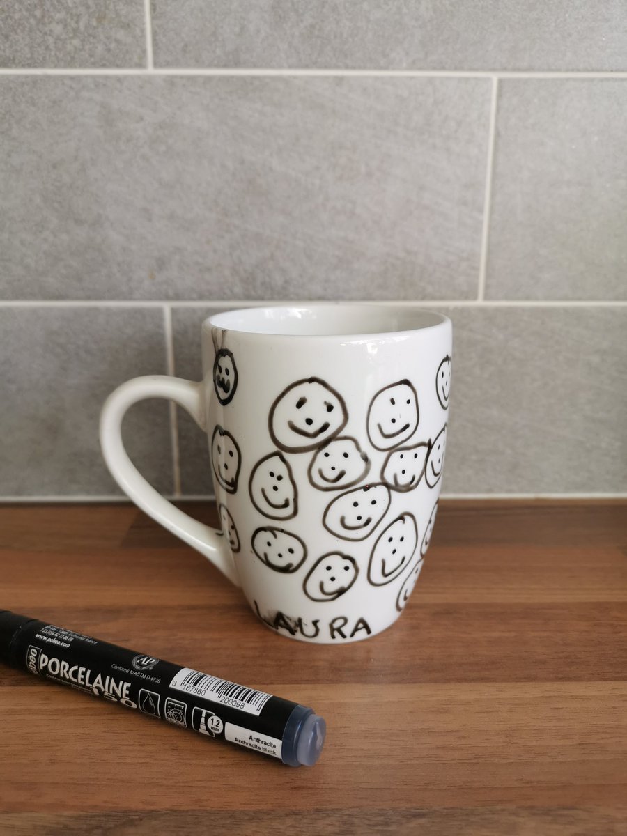 @latimerprimary #classhc #classcj In a break from schoolwork, Laura and Joseph decorated half a mug each (we only had one) Laura has drawn smiley faces. Joseph's design was never in doubt #predictable @okazakiofficial