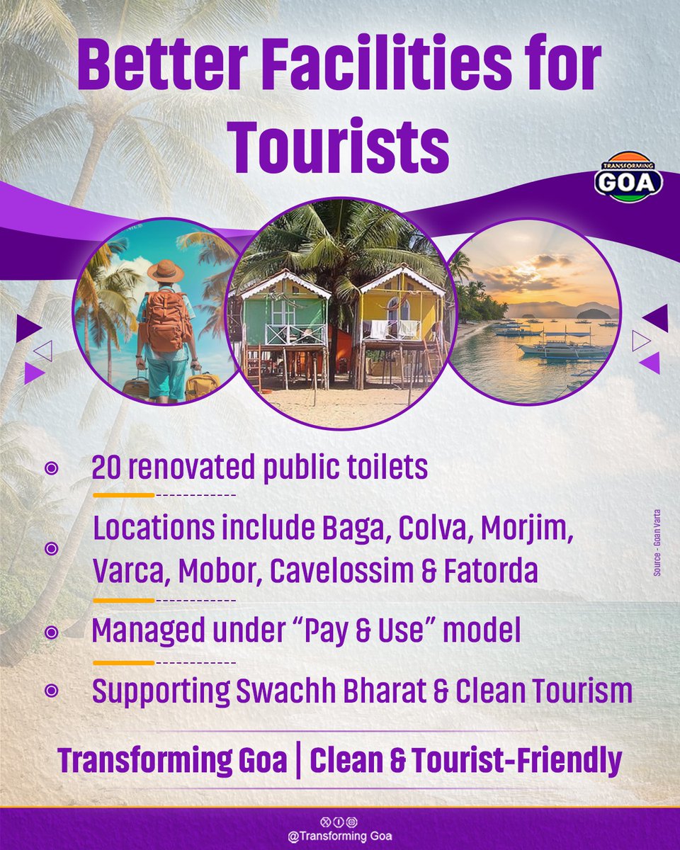 Better facilities for tourists 20 renovated pay & use toilets at top spots – Clean, convenient, and tourist-friendly! @DrPramodPSawant @goacm #CleanGoa #TouristFriendly #SwachhBharat #TransformingGoa #CMPramodSawant #GoaTourism