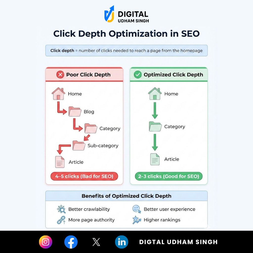 Click depth matters in SEO 🔍 Pages within 2–3 clicks perform better than those buried 4–5 clicks deep. Better crawlability. Better UX. Better rankings. 🚀 #SEO #TechnicalSEO #ClickDepth #SEOTips #digitaludhamsingh