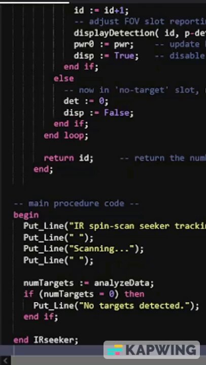 #Coding_Fridays : IR seeker tracking algorithm for spin-scan sensor in Ada Watch the full video at Youtube channel central -- youtu.be/aAUSfPlec04 Source code available at the Github repository (see channel info). #asmr #coding #programming #notalking #ada #terminal #console