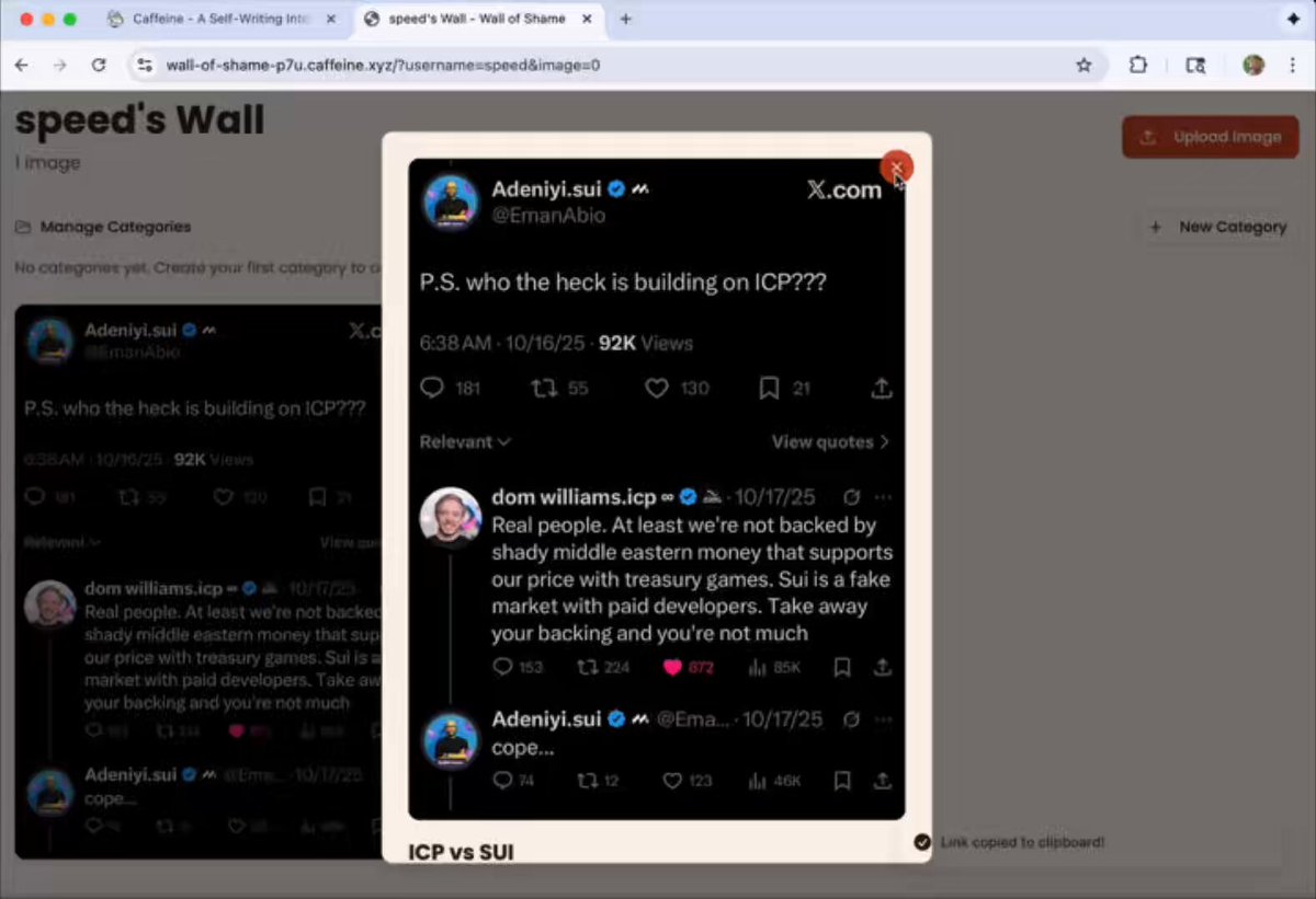 I just built an app that lets you upload and share your “I told you so screenshots” that live on forever on the $ICP blockchain using @caffeineai Inspired by @CryptoWizardd Check it out -> wall-of-shame-p7u.caffeine.xyz