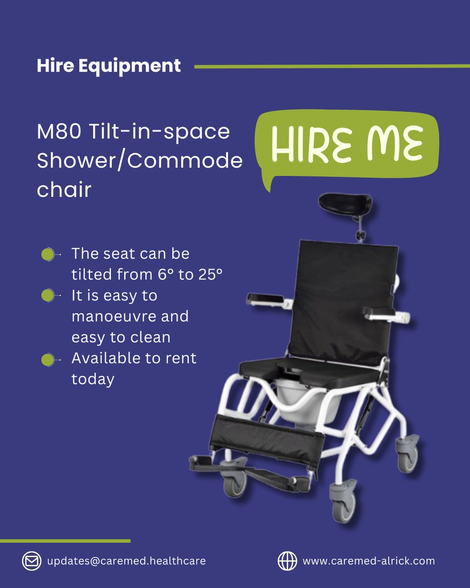 Looking for a Tilt-in-Space Shower Commode Chair? 🚿 You’ve got to see the M80 — supportive, comfy, and easy to use. And yes, it’s available for hire! 💺 Contact us today to book yours. #Hire #ShowerChair #CommodeChair #PatientCare