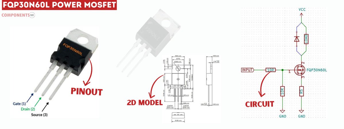 Learn today’s component: components101.com/mosfets/fqp30n… ➡️️The FQP30N60L MOSFET: Handles moderate currents, high voltage, and supports logic-level switching. ➡️Applications: Converters ➡️Alternatives: IRFZ44N ➡️Manufacturer: Fairchild Semiconductor #FQP30N60L #MOSFET #Component101