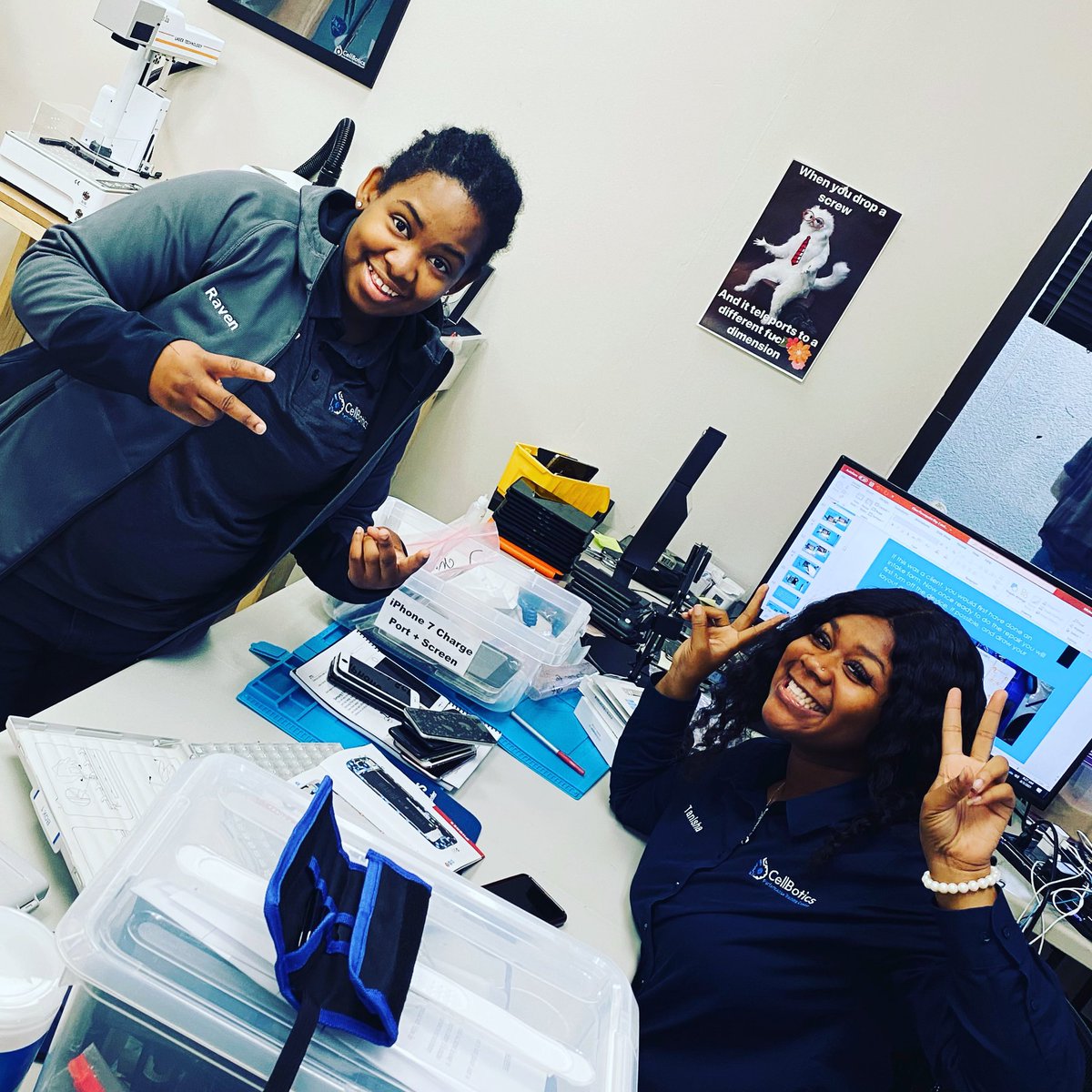 Trainers Tanisha and Raven (in her new CellBotics gear!) getting ready for the 2nd day on class! #cellbotics #cellphonerepair #computerrepairtraining