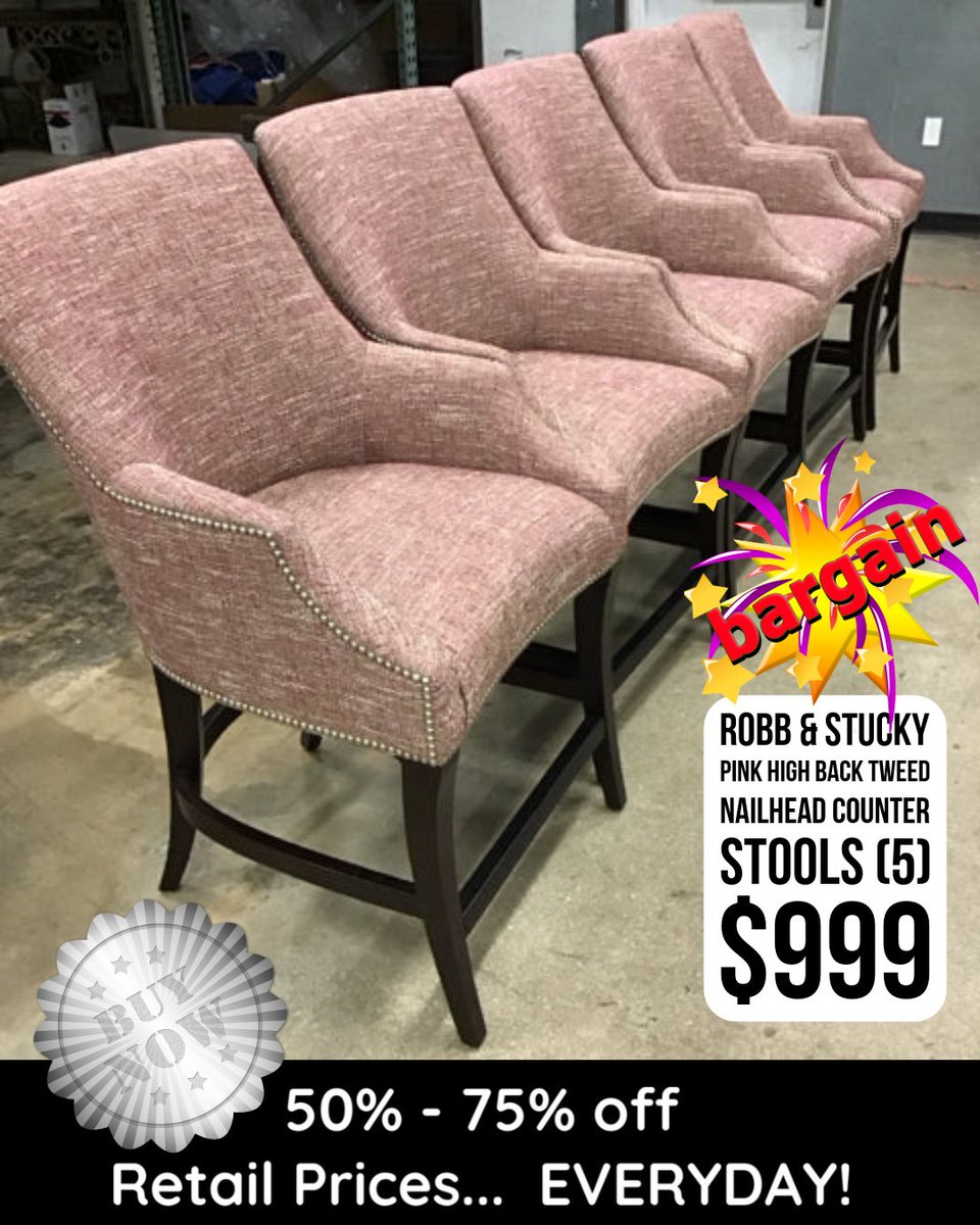 Turn your counter space into a statement with these 5 Robb & Stucky pink tweed nailhead stools. Chic, comfy, and built to impress — all for $999. #EncoreInteriors #FurnitureGoals #ConsignmentTreasure #RobbAndStucky #InteriorDesignInspo #HomeBarStyle #LuxuryLookLessPrice
