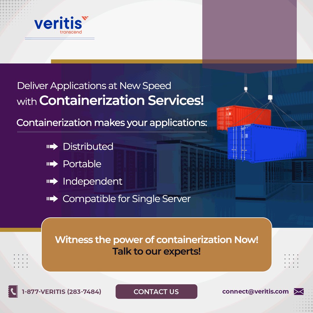 Containerization makes your applications: • Distributed • Portable • Independent • Compatible for Single Server Witness the power of #containerization Now! Talk to our experts! bit.ly/3hCuerk @Veritis_Group #containerizationsolutions #containerizationservices