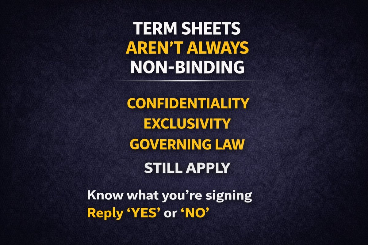 Term sheets aren’t always non-binding. Some clauses still apply confidentiality, exclusivity, governing law. And once you sign, your leverage can drop. Did you know this? #Startups #Fundraising #Contracts #LegalRisk