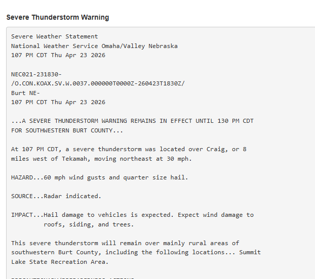#Nebraska Severe Thunderstorm Warning for #BurtCounty in Nebraska till 1:30. At 1:07, a severe thunderstorm was located over #Craig, or 8 miles west of #Tekamah, moving NE at 30. 60 mph wind gusts & quarter size hail. #SevereThunderstormWarning