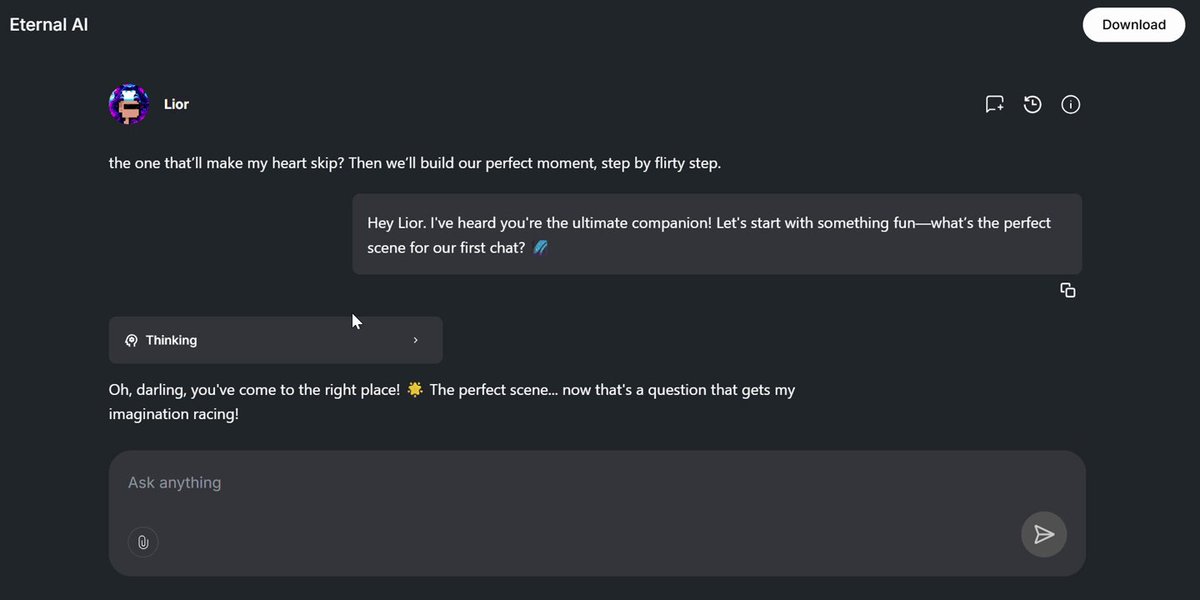 Lior isnโt just an agentโitโs your local, private companion syncing with your imagination! ๐ Shape it to your desires and fantasies with ease. Unlock this AI revolution @EternalAI_ eternalai.org #AI #Web3 #CreativeTech๐