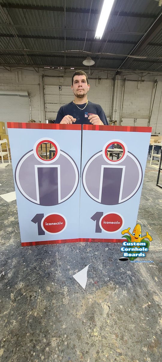 Another fun day in the books, filled with sawdust, screws, and beautiful cornhole boards heading to happy customers! 🌽🔨 Check out this custom set we made for Iconective - a unique way to advertise your biz! #cornhole #customboards #marketing #smallbusiness